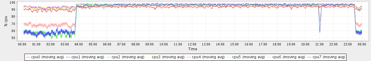 avg(cpu0) = 92.66 avg(cpu1) = 88.73 avg(cpu2) = 88.61 avg(cpu3) = 94.95 avg(cpu4) = 96.10 avg(cpu5) = 96.01 avg(cpu6) = 91.75 avg(cpu7) = 96.13