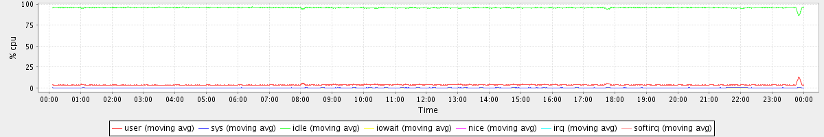 avg(user) = 3.68 avg(sys) = 0.30 avg(idle) = 95.86 avg(iowait) = 0.08 avg(nice) = 0.00 avg(irq) = 0.00 avg(softirq) = 0.05