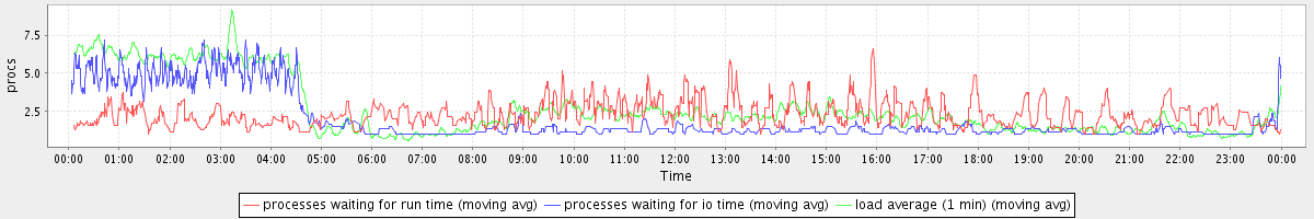 avg(processes waiting for run time) = 1.19 avg(processes waiting for io time) = 1.30 avg(load average (1 min)) = 2.64