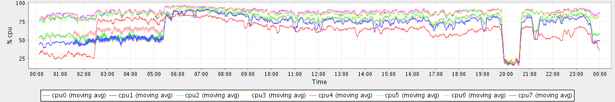 avg(cpu0) = 1.68 avg(cpu1) = 0.50 avg(cpu2) = 0.43 avg(cpu3) = 0.31 avg(cpu4) = 0.24 avg(cpu5) = 0.28 avg(cpu6) = 0.40 avg(cpu7) = 0.30