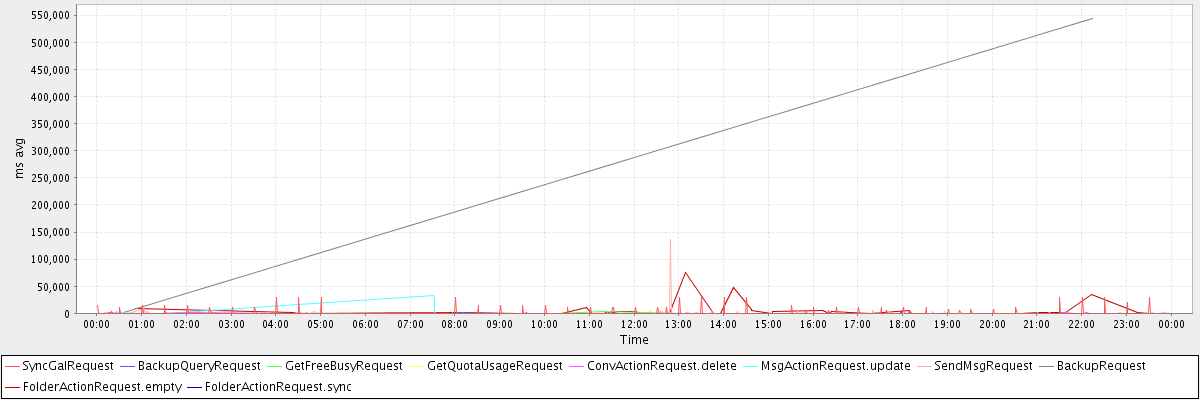 avg(SyncGalRequest) = 785.18 avg(BackupQueryRequest) = 409.80 avg(GetFreeBusyRequest) = 447.50 avg(GetQuotaUsageRequest) = 3206.00 avg(ConvActionRequest.delete) = 329.33 avg(MsgActionRequest.update) = 468.06 avg(SendMsgRequest) = 461.74 avg(BackupRequest) = 272686.00 avg(FolderActionRequest.empty) = 4300.72 avg(FolderActionRequest.sync) = 1735.50