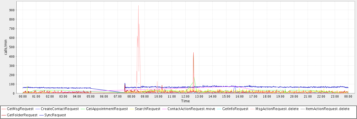 max(GetMsgRequest) = 440.00 max(CreateContactRequest) = 76.00 max(GetAppointmentRequest) = 429.00 max(SearchRequest) = 80.00 max(ContactActionRequest.move) = 76.00 max(GetInfoRequest) = 79.00 max(MsgActionRequest.delete) = 949.00 max(ItemActionRequest.delete) = 104.00 max(GetFolderRequest) = 93.00 max(SyncRequest) = 108.00