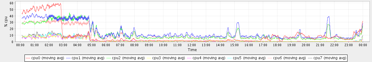 avg(cpu0) = 21.07 avg(cpu1) = 8.80 avg(cpu2) = 8.51 avg(cpu3) = 7.49 avg(cpu4) = 6.10 avg(cpu5) = 7.11 avg(cpu6) = 7.96 avg(cpu7) = 7.52