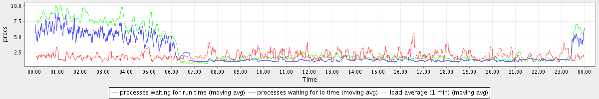 avg(processes waiting for run time) = 0.95 avg(processes waiting for io time) = 1.78 avg(load average (1 min)) = 3.14