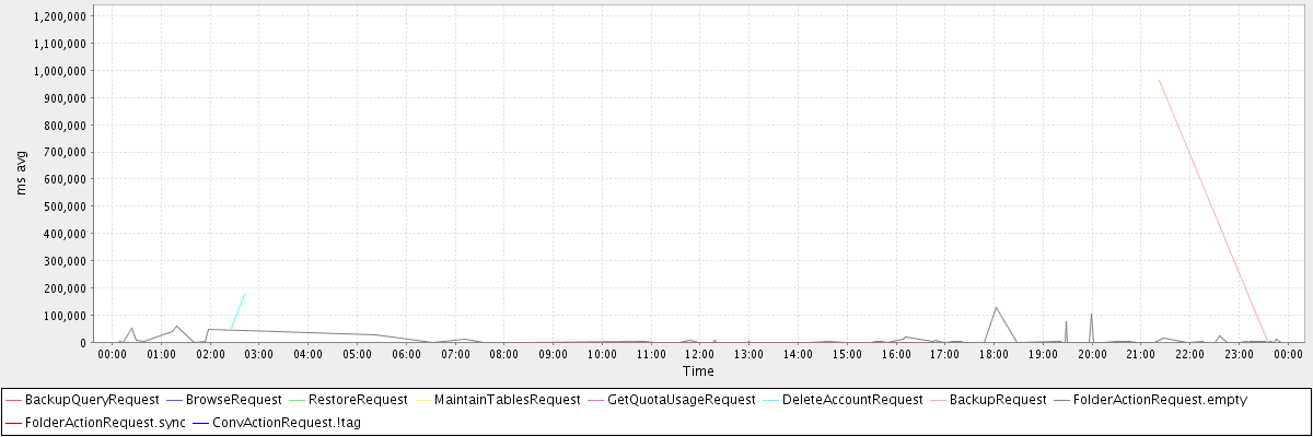 avg(BackupQueryRequest) = 647.00 avg(BrowseRequest) = 685.00 avg(RestoreRequest) = 1183528.00 avg(MaintainTablesRequest) = 191933.00 avg(GetQuotaUsageRequest) = 3271.00 avg(DeleteAccountRequest) = 113819.50 avg(BackupRequest) = 482390.50 avg(FolderActionRequest.empty) = 7881.26 avg(FolderActionRequest.sync) = 2869.00 avg(ConvActionRequest.!tag) = 1521.00