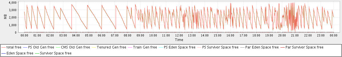 avg(total free) = 2010.72 avg(PS Old Gen free) = 0.00 avg(CMS Old Gen free) = 1989.72 avg(Tenured Gen free) = 0.00 avg(Train Gen free) = 0.00 avg(PS Eden Space free) = 0.00 avg(PS Survivor Space free) = 0.00 avg(Par Eden Space free) = 20.94 avg(Par Survivor Space free) = 0.06 avg(Eden Space free) = 0.00 avg(Survivor Space free) = 0.00