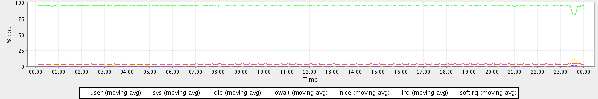 avg(user) = 3.49 avg(sys) = 0.28 avg(idle) = 95.87 avg(iowait) = 0.35 avg(nice) = 0.00 avg(irq) = 0.00 avg(softirq) = 0.00