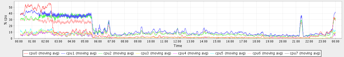 avg(cpu0) = 22.22 avg(cpu1) = 9.65 avg(cpu2) = 8.39 avg(cpu3) = 7.88 avg(cpu4) = 6.34 avg(cpu5) = 6.57 avg(cpu6) = 8.48 avg(cpu7) = 7.08