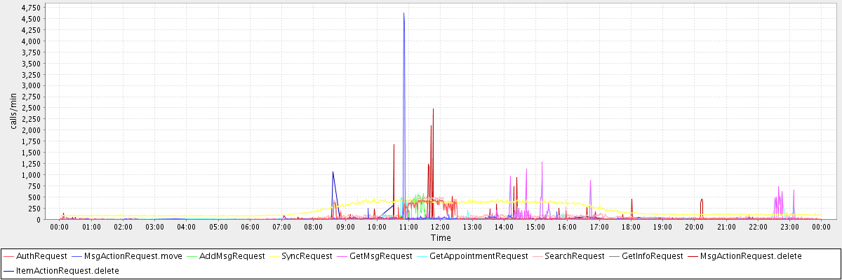 max(AuthRequest) = 430.00 max(MsgActionRequest.move) = 4622.00 max(AddMsgRequest) = 583.00 max(SyncRequest) = 505.00 max(GetMsgRequest) = 1286.00 max(GetAppointmentRequest) = 1175.00 max(SearchRequest) = 509.00 max(GetInfoRequest) = 438.00 max(MsgActionRequest.delete) = 2474.00 max(ItemActionRequest.delete) = 1062.00