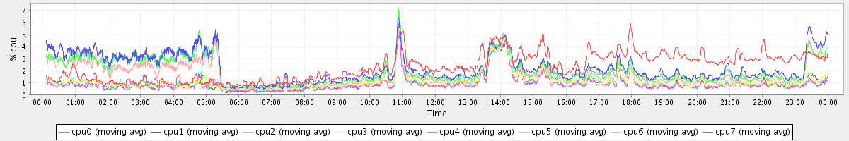 avg(cpu0) = 5.17 avg(cpu1) = 17.30 avg(cpu2) = 14.57 avg(cpu3) = 2.63 avg(cpu4) = 2.62 avg(cpu5) = 3.21 avg(cpu6) = 13.26 avg(cpu7) = 2.68