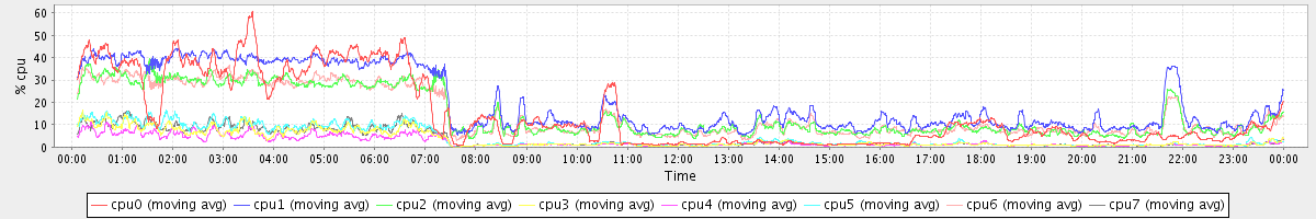 avg(cpu0) = 14.74 avg(cpu1) = 19.86 avg(cpu2) = 14.73 avg(cpu3) = 3.35 avg(cpu4) = 2.44 avg(cpu5) = 4.10 avg(cpu6) = 14.63 avg(cpu7) = 3.60