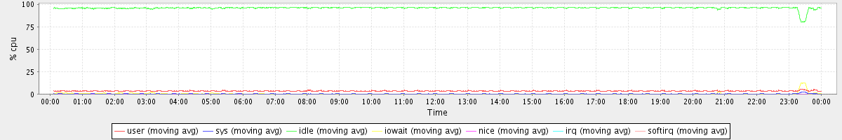 avg(user) = 3.38 avg(sys) = 0.29 avg(idle) = 95.96 avg(iowait) = 0.36 avg(nice) = 0.00 avg(irq) = 0.00 avg(softirq) = 0.00