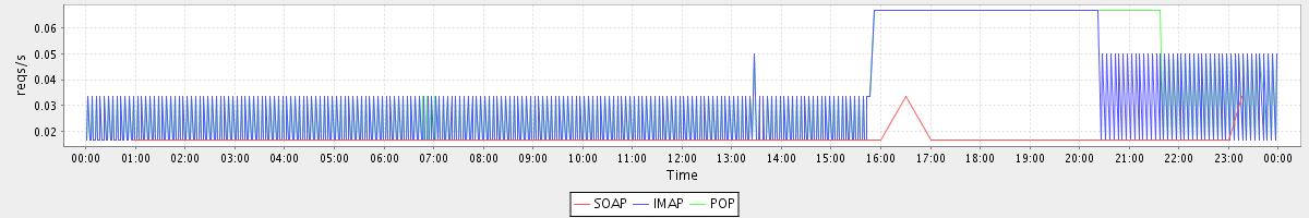Host zm01-int.stanford.edu: Mailboxd: Request Rate by Client Protocol