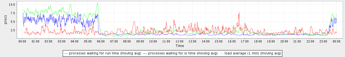 avg(processes waiting for run time) = 1.21 avg(processes waiting for io time) = 1.64 avg(load average (1 min)) = 3.18