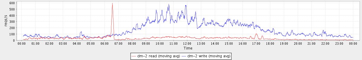 avg(dm-1 read) = 28.58 avg(dm-1 write) = 721.85