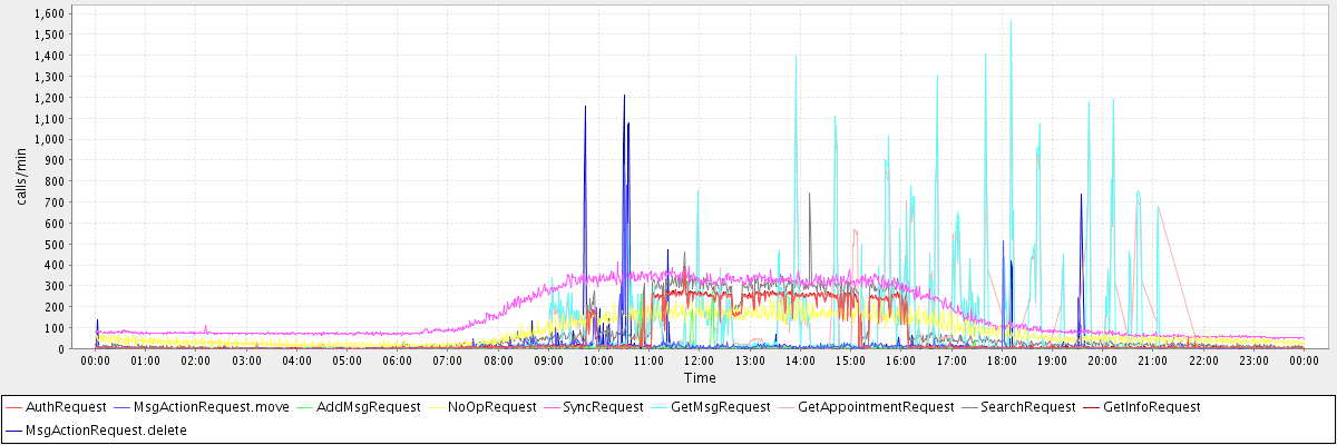 max(AuthRequest) = 382.00 max(MsgActionRequest.move) = 875.00 max(AddMsgRequest) = 269.00 max(NoOpRequest) = 269.00 max(SyncRequest) = 411.00 max(GetMsgRequest) = 1565.00 max(GetAppointmentRequest) = 1487.00 max(SearchRequest) = 745.00 max(GetInfoRequest) = 394.00 max(MsgActionRequest.delete) = 1209.00