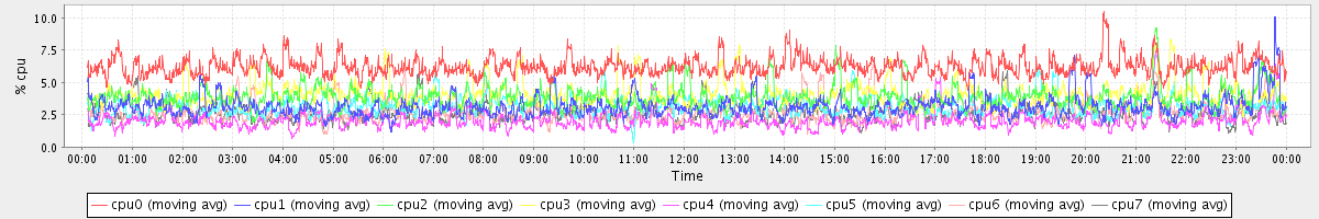 avg(cpu0) = 6.21 avg(cpu1) = 3.14 avg(cpu2) = 3.88 avg(cpu3) = 4.10 avg(cpu4) = 2.06 avg(cpu5) = 3.15 avg(cpu6) = 2.66 avg(cpu7) = 2.61