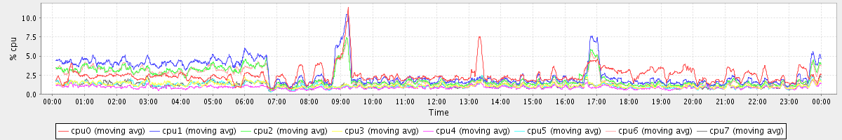 avg(cpu0) = 9.13 avg(cpu1) = 19.01 avg(cpu2) = 14.57 avg(cpu3) = 3.73 avg(cpu4) = 2.76 avg(cpu5) = 4.48 avg(cpu6) = 14.21 avg(cpu7) = 4.17