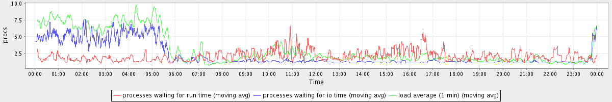 avg(processes waiting for run time) = 1.13 avg(processes waiting for io time) = 1.56 avg(load average (1 min)) = 3.06