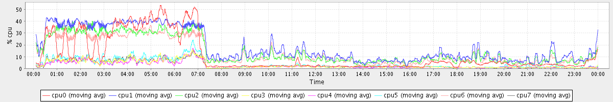 avg(cpu0) = 1.98 avg(cpu1) = 0.45 avg(cpu2) = 0.39 avg(cpu3) = 0.22 avg(cpu4) = 0.19 avg(cpu5) = 0.21 avg(cpu6) = 0.34 avg(cpu7) = 0.21