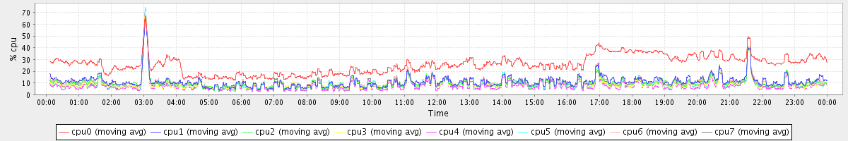 avg(cpu0) = 25.73 avg(cpu1) = 11.12 avg(cpu2) = 10.17 avg(cpu3) = 9.36 avg(cpu4) = 7.99 avg(cpu5) = 9.04 avg(cpu6) = 10.46 avg(cpu7) = 9.70