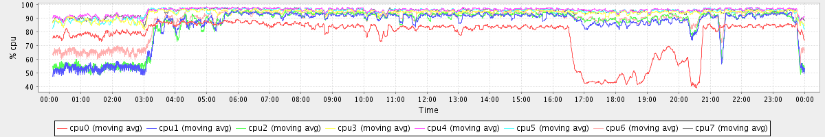 avg(cpu0) = 16.17 avg(cpu1) = 5.46 avg(cpu2) = 4.91 avg(cpu3) = 4.69 avg(cpu4) = 3.05 avg(cpu5) = 3.56 avg(cpu6) = 4.62 avg(cpu7) = 3.78