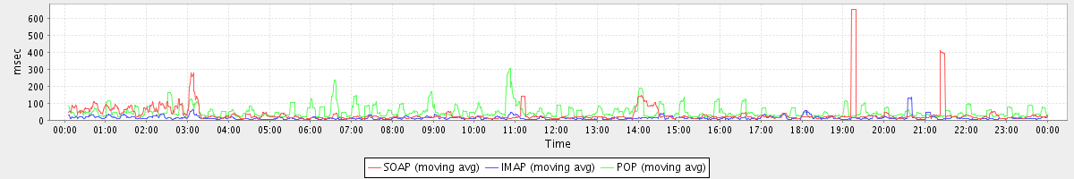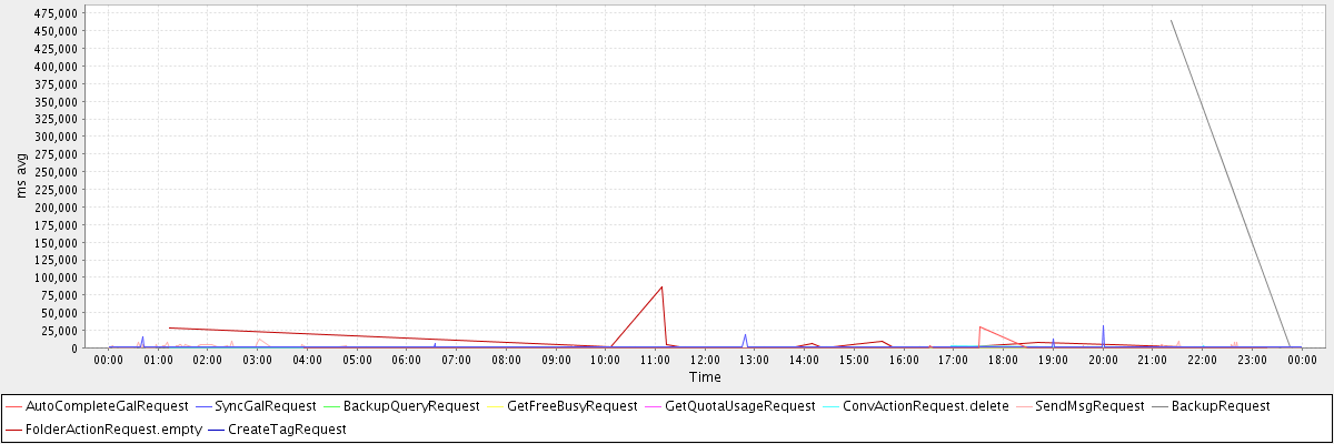 avg(AutoCompleteGalRequest) = 739.20 avg(SyncGalRequest) = 888.89 avg(BackupQueryRequest) = 357.60 avg(GetFreeBusyRequest) = 428.00 avg(GetQuotaUsageRequest) = 3315.00 avg(ConvActionRequest.delete) = 283.97 avg(SendMsgRequest) = 364.46 avg(BackupRequest) = 233059.50 avg(FolderActionRequest.empty) = 5857.04 avg(CreateTagRequest) = 2335.00