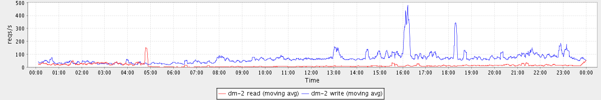 avg(dm-1 read) = 14.32 avg(dm-1 write) = 482.15