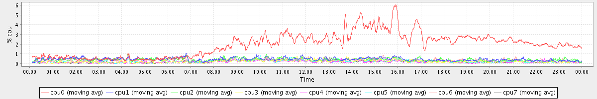 avg(cpu0) = 1.94 avg(cpu1) = 0.43 avg(cpu2) = 0.40 avg(cpu3) = 0.24 avg(cpu4) = 0.18 avg(cpu5) = 0.21 avg(cpu6) = 0.34 avg(cpu7) = 0.20