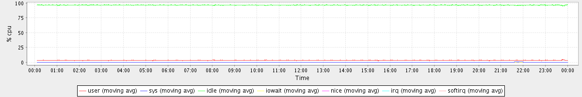 avg(user) = 3.15 avg(sys) = 0.22 avg(idle) = 96.60 avg(iowait) = 0.01 avg(nice) = 0.00 avg(irq) = 0.00 avg(softirq) = 0.00