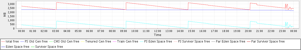 avg(total free) = 2692.83 avg(PS Old Gen free) = 2272.12 avg(CMS Old Gen free) = 0.00 avg(Tenured Gen free) = 0.00 avg(Train Gen free) = 0.00 avg(PS Eden Space free) = 417.22 avg(PS Survivor Space free) = 3.49 avg(Par Eden Space free) = 0.00 avg(Par Survivor Space free) = 0.00 avg(Eden Space free) = 0.00 avg(Survivor Space free) = 0.00