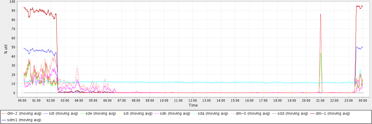 avg(dm-2) = 2.64 avg(sdl) = 5.82 avg(sde) = 2.21 avg(sdi) = 2.22 avg(sdk) = 2.55 avg(sda) = 11.71 avg(dm-0) = 4.21 avg(sdd) = 0.00 avg(dm-1) = 11.24 avg(sdm1) = 0.00