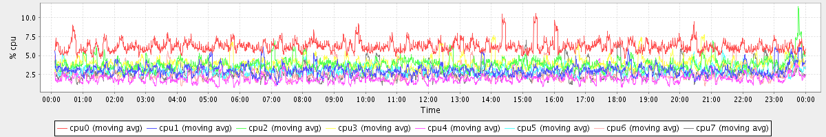 avg(cpu0) = 6.20 avg(cpu1) = 3.09 avg(cpu2) = 3.87 avg(cpu3) = 4.01 avg(cpu4) = 2.04 avg(cpu5) = 3.13 avg(cpu6) = 2.64 avg(cpu7) = 2.70
