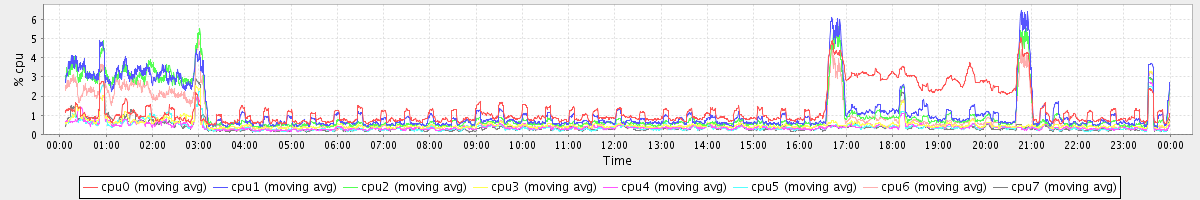 avg(cpu0) = 1.33 avg(cpu1) = 1.23 avg(cpu2) = 1.08 avg(cpu3) = 0.52 avg(cpu4) = 0.40 avg(cpu5) = 0.39 avg(cpu6) = 0.78 avg(cpu7) = 0.39