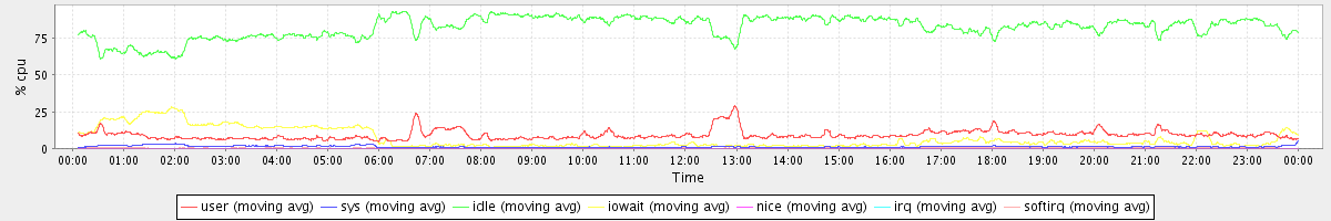 avg(user) = 9.22 avg(sys) = 1.23 avg(idle) = 82.62 avg(iowait) = 6.56 avg(nice) = 0.00 avg(irq) = 0.05 avg(softirq) = 0.34