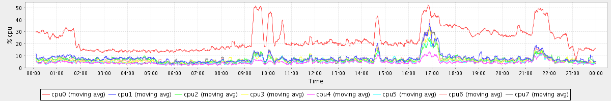 avg(cpu0) = 1.13 avg(cpu1) = 0.26 avg(cpu2) = 0.23 avg(cpu3) = 0.11 avg(cpu4) = 0.08 avg(cpu5) = 0.09 avg(cpu6) = 0.18 avg(cpu7) = 0.10