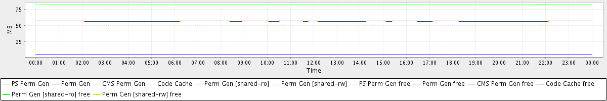 avg(PS Perm Gen) = 0.00 avg(Perm Gen) = 0.00 avg(CMS Perm Gen) = 82.08 avg(Code Cache) = 43.02 avg(Perm Gen [shared-ro]) = 0.00 avg(Perm Gen [shared-rw]) = 0.00 avg(PS Perm Gen free) = 0.00 avg(Perm Gen free) = 0.00 avg(CMS Perm Gen free) = 56.48 avg(Code Cache free) = 4.61 avg(Perm Gen [shared-ro] free) = 0.00 avg(Perm Gen [shared-rw] free) = 0.00