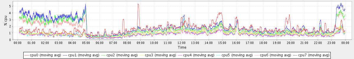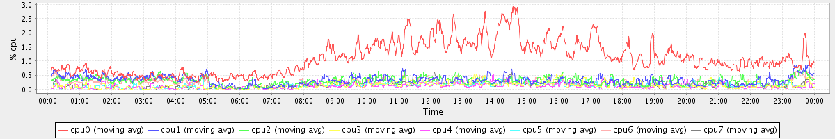 avg(cpu0) = 1.10 avg(cpu1) = 0.32 avg(cpu2) = 0.29 avg(cpu3) = 0.14 avg(cpu4) = 0.11 avg(cpu5) = 0.14 avg(cpu6) = 0.24 avg(cpu7) = 0.13