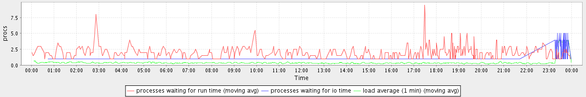avg(processes waiting for run time) = 0.37 avg(processes waiting for io time) = 0.09 avg(load average (1 min)) = 0.43