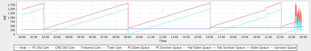 avg(total) = 1119.50 avg(PS Old Gen) = 337.99 avg(CMS Old Gen) = 0.00 avg(Tenured Gen) = 0.00 avg(Train Gen) = 0.00 avg(PS Eden Space) = 751.63 avg(PS Survivor Space) = 29.88 avg(Par Eden Space) = 0.00 avg(Par Survivor Space) = 0.00 avg(Eden Space) = 0.00 avg(Survivor Space) = 0.00
