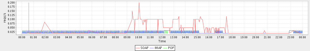 max(SearchRequest) = 4.00 max(GetFolderRequest) = 12.00 max(BackupRequest) = 1.00 max(GetInfoRequest) = 2.00 max(DismissCalendarItemAlarmRequest) = 1.00 max(GetServerRequest) = 1.00 max(AuthRequest) = 2.00 max(GetMiniCalRequest) = 2.00 max(NoOpRequest) = 6.00 max(GetDomainInfoRequest) = 3.00