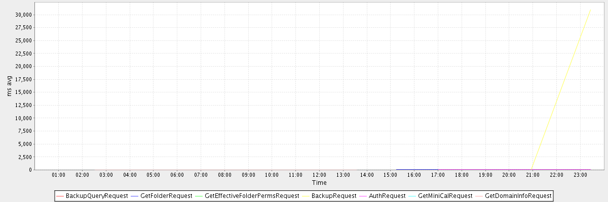 avg(BackupQueryRequest) = 802.00 avg(GetFolderRequest) = 90.50 avg(GetEffectiveFolderPermsRequest) = 1.00 avg(BackupRequest) = 15519.00 avg(AuthRequest) = 46.33 avg(GetMiniCalRequest) = 7.00 avg(GetDomainInfoRequest) = 0.08