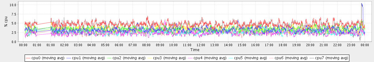 avg(cpu0) = 4.69 avg(cpu1) = 3.22 avg(cpu2) = 3.40 avg(cpu3) = 3.56 avg(cpu4) = 2.37 avg(cpu5) = 2.63 avg(cpu6) = 2.71 avg(cpu7) = 2.63