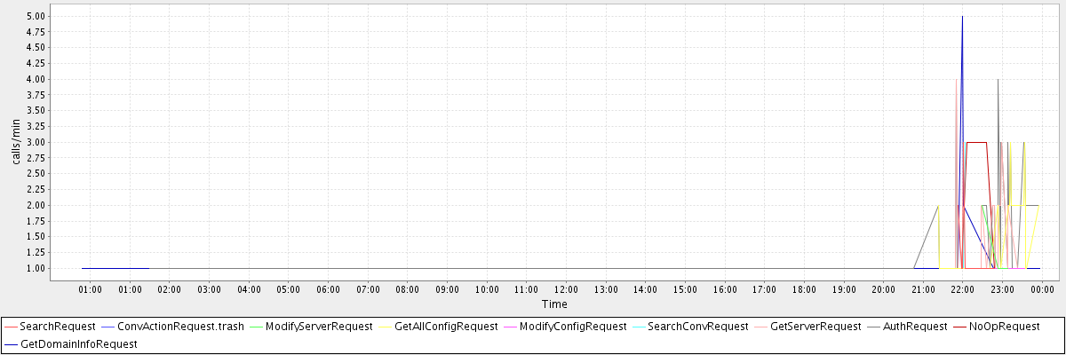 max(SearchRequest) = 3.00 max(ConvActionRequest.trash) = 2.00 max(ModifyServerRequest) = 2.00 max(GetAllConfigRequest) = 3.00 max(ModifyConfigRequest) = 1.00 max(SearchConvRequest) = 3.00 max(GetServerRequest) = 4.00 max(AuthRequest) = 4.00 max(NoOpRequest) = 3.00 max(GetDomainInfoRequest) = 5.00