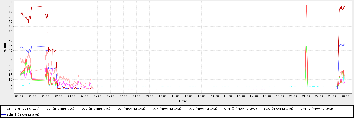 avg(dm-2) = 2.36 avg(sdl) = 4.74 avg(sde) = 1.97 avg(sdi) = 1.93 avg(sdk) = 2.36 avg(sda) = 3.18 avg(dm-0) = 4.29 avg(sdd) = 0.00 avg(dm-1) = 8.80 avg(sdm1) = 0.00