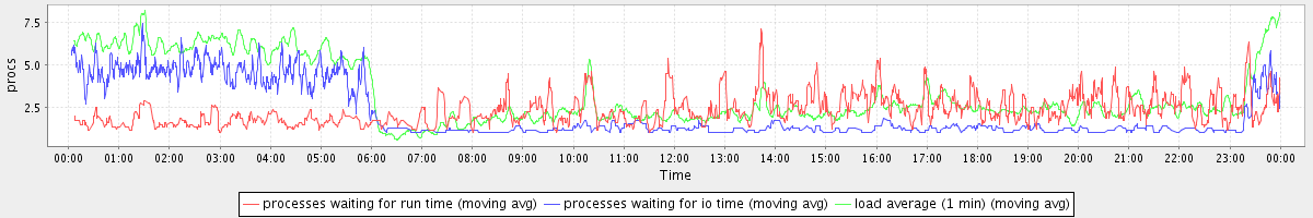 avg(processes waiting for run time) = 1.51 avg(processes waiting for io time) = 1.54 avg(load average (1 min)) = 3.29