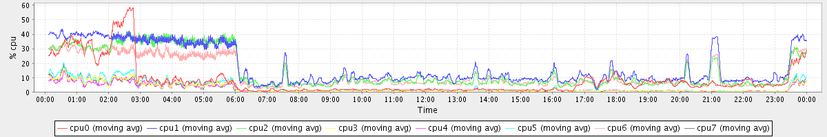 avg(cpu0) = 2.01 avg(cpu1) = 2.19 avg(cpu2) = 1.87 avg(cpu3) = 0.94 avg(cpu4) = 0.81 avg(cpu5) = 0.89 avg(cpu6) = 1.61 avg(cpu7) = 0.84