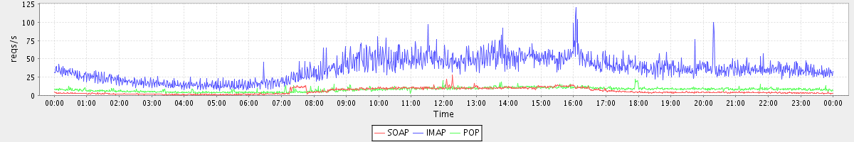 Host zm02.stanford.edu: Mailboxd: Request Rate by Client Protocol