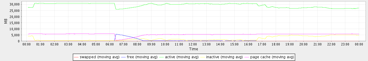 avg(swapped) = 0.25 avg(free) = 370.36 avg(active) = 29174.47 avg(inactive) = 1925.54 avg(page cache) = 5346.25