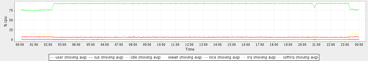 avg(user) = 6.51 avg(sys) = 0.70 avg(idle) = 90.69 avg(iowait) = 2.08 avg(nice) = 0.00 avg(irq) = 0.00 avg(softirq) = 0.02